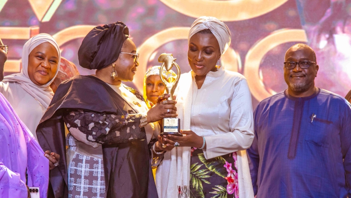 L-R: Minister of State for Education Dr Suwaiba Said Ahmad, Minister of Women Affairs and Social Development, Hajiya Imaan Sulaiman-Ibrahim, Director General, National Emergency Management Agency (NEMA), Mrs Zubaida Umar and her husband, Mr Kashim Tumsah during the presentation of the award of African Iconic Woman in Public Service of the Year to the Director General NEMA in Abuja on Friday, 23rd May, 2025.
